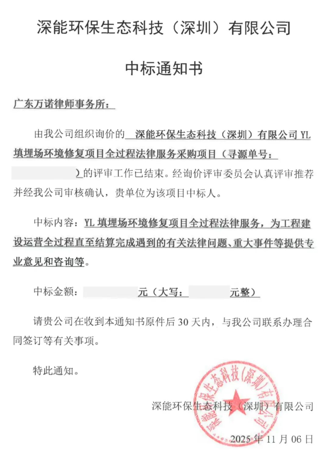 万诺律所成功中标深能环保生态科技(深圳)有限公司填埋场环境修复项目全过程法律服务采购项目