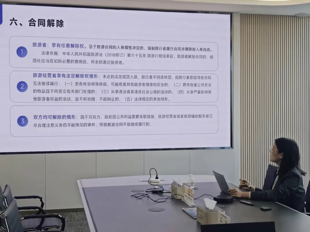 针对行业痛点与实务难点,徐小恩律师结合典型案例展开针对性分享:深入剖析 “擅自转拼团”“不合理低价游”“格式条款无效情形” 等常见违规行为的法律后果,给出具体合规建议;针对孕妇、老人、未成年人等特殊群体参团争议,明确旅行社不得无故拒绝参团的法律原则,同时提供了安全告知书签署、直系亲属确认等风险防控方案;围绕合同签订环节,强调书面签订的强制性要求,提示代签授权、行程单附件、付款节点约定等关键注意事项,避免 “霸王条款” 引发的法律风险。此外,还对行程中行李保管、自由活动期间安全责任、突发事件处置等实务问题,给出了可直接落地的解决方案。